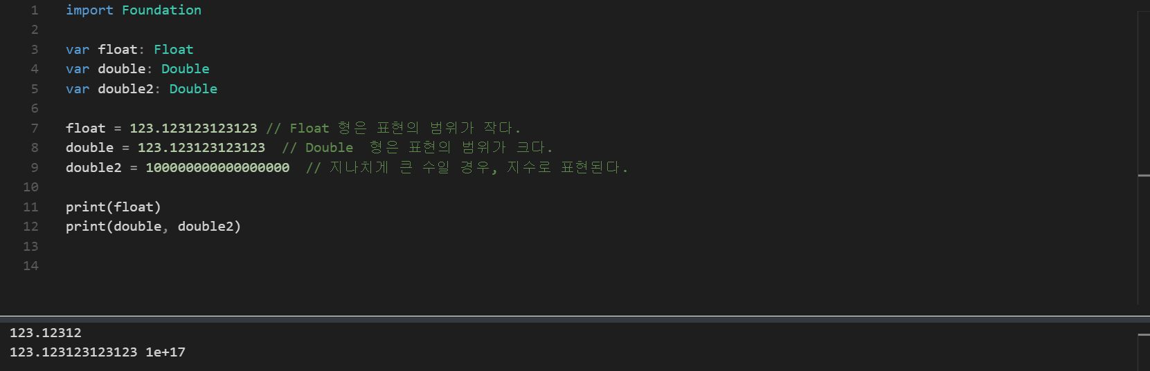 두 데이터 타입은 소수점을 가진 숫자를 표현할 수 있습니다. 단 Float는 32비트, Double는 64비트를 이용합니다. 특별한 이유가 없다면 Double을 사용하는 것이 좋습니다. 큰 숫자들을 보다 정확화게 표현이 가능하기 때문이죠.