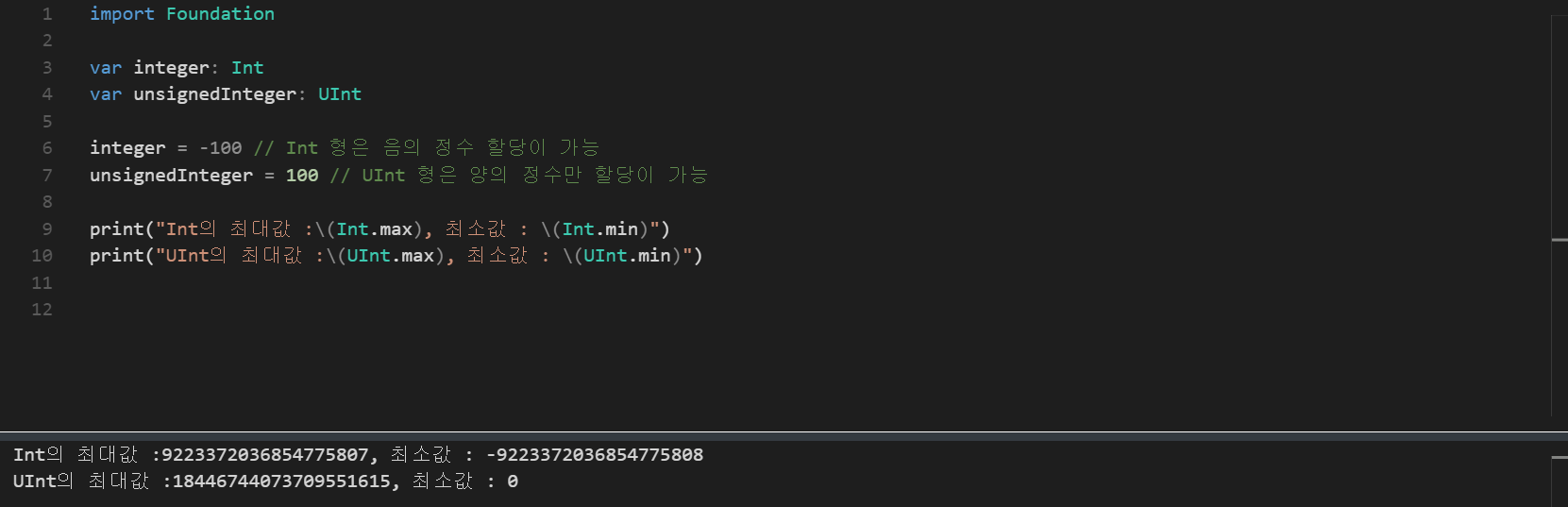데이터 타입인 Int와 UInt에 대한 최대값 및 최소값