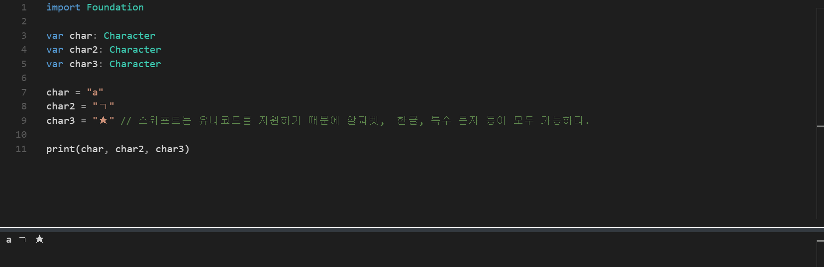 문자를 표현할 수 있는 데이터 타입입니다. 즉 한 개의 문자, 예를 들면 'a', 'ㄱ', 특수 문자 등을 표현할 수 있어요. 스위프트는 유니코드를 지원하기에 알파벳 뿐만 아니라 한글, 특수문자도 표현히 가능한 것이죠.