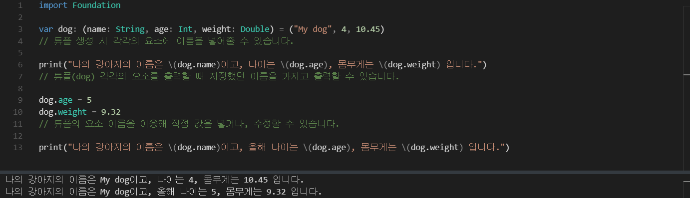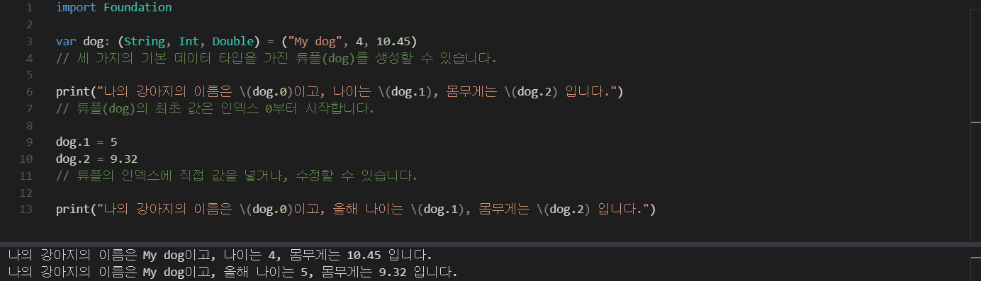 print("나의 강아지의 이름은 \(dog.0)이고, 나이는 \(dog.1), 몸무게는 \(dog.2) 입니다.")