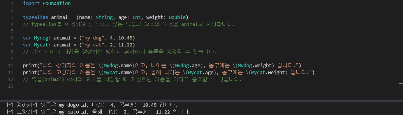 // typealias를 이용하여 생성하고 싶은 튜플의 요소의 묶음을 animal로 지정합니다.